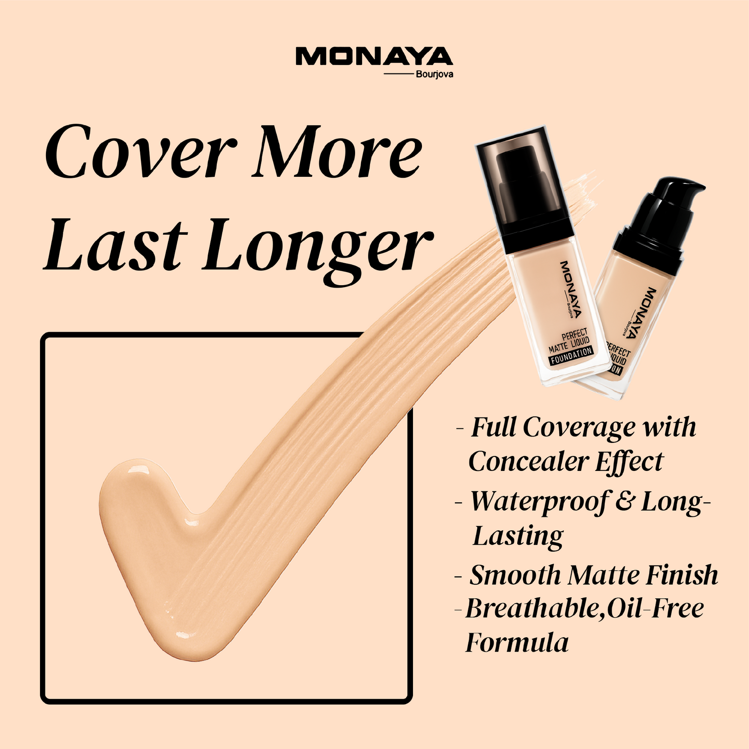 Full Coverage & Matte Finish: Achieve flawless skin with the Monaya Bourjova Perfect Matte Liquid Foundation. It offers full coverage that lasts all day, leaving your skin with a smooth, matte finish.