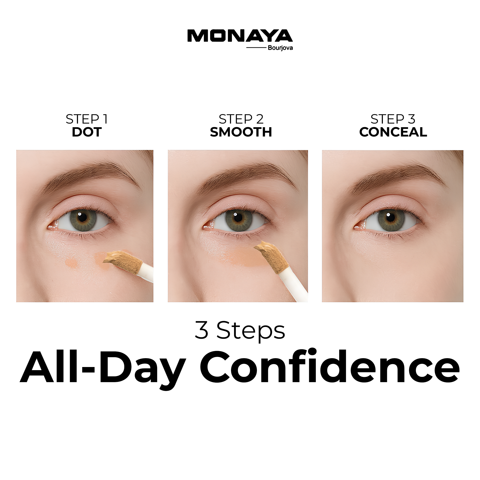 Full Coverage & Waterproof: Monaya Bourjova Full Cover Concealer provides ultimate full coverage, effectively concealing dark circles, blemishes, and imperfections, all while being waterproof for long-lasting wear.
